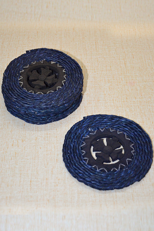 Beautiful and earthy; these coasters have a Sabai Grass rope curled around 3inch carved wooden plate. Add a touch of rustic charm to your home and office. Also perfect for gifting.